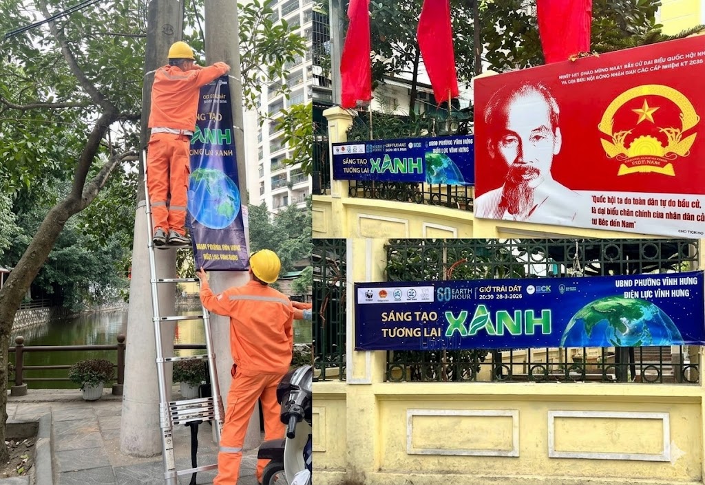Hình ảnh nhân viên Điện lực Vĩnh Hưng treo băng rôn hưởng ứng giờ trái đất 2026
